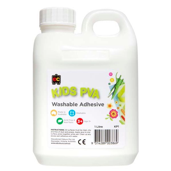 Educational Colours Kids Washable PVA Glue 1ltr. EC Kids PVA Glue 5L is a must-have for classrooms and art rooms, providing a reliable, non-toxic adhesive for a wide range of creative projects. Australian-made and acid-free, this high-quality glue bonds effectively to paper, cardboard, wood, fabrics, most plastics, and other craft materials. It dries clear and smooth for a professional finish, making it ideal for everything from collage work to construction projects. With a pH-neutral, non-staining formula, it’s safe for young artists and easily washes off hands and clothing, ensuring a mess-free experience