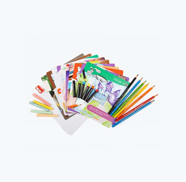 10 x activity cards, 6 x coloured pencils, 1 x 2B graphite pencil, 6 x coloured oil pastels, 12 x sheets of drawing paper, 5 x coloured chalks, 1 x pencil sharpener, 1 x eraser